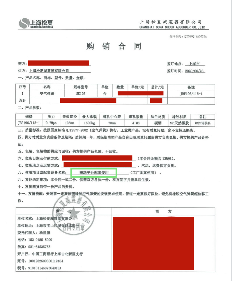 上海松夏減震器有限公司官方網(wǎng)站為您介紹:【震動(dòng)平臺(tái)配套】使用上海松夏JBF196/115-1采購(gòu)合同信息,我們松夏公司2020年為【震動(dòng)平臺(tái)配套】使用上海松夏JBF196/115-1,起到了減震和降噪的作用,以下是【震動(dòng)平臺(tái)配套】使用上海松夏JBF196/115-1采購(gòu)合同介紹
